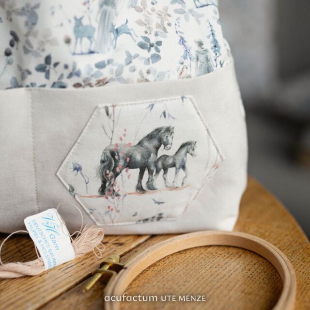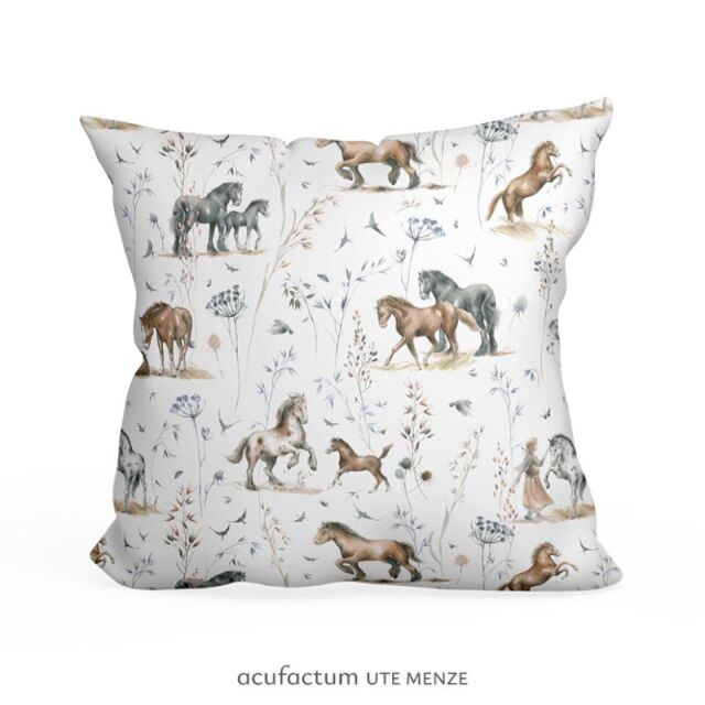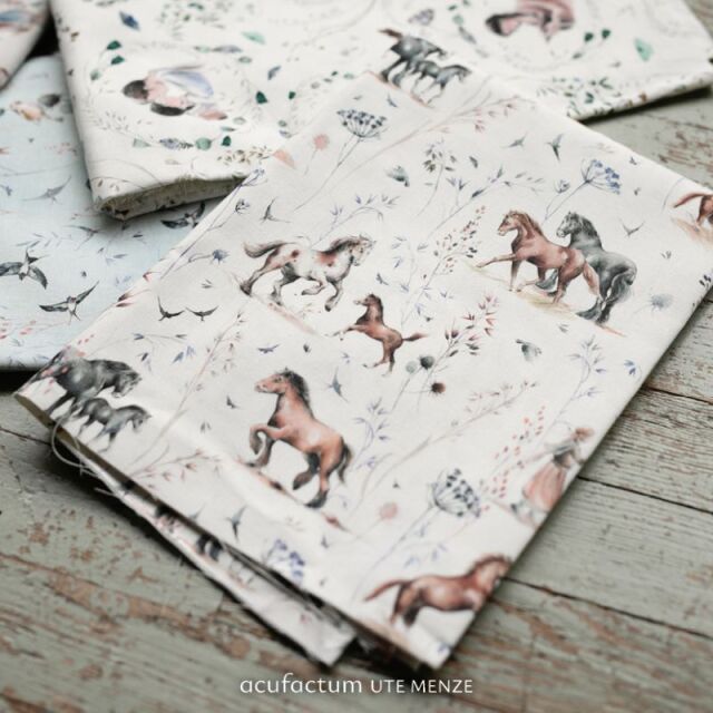 このコットン生地は、自然、自由、そして優しい出会いが融合する田園の世界へと誘います。才能あふれるアーティスト、ソフィア・ドレッシャーによるデザインは、生命力と軽やかさに満ちた物語を描いています。優雅に草原を駆ける馬たち、穏やかに草を食む馬、跳ね回る馬たちが描かれ、そこに軽やかな蝶たちが舞い、デザインに遊び心を与えています。