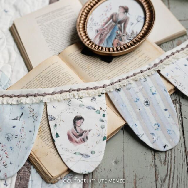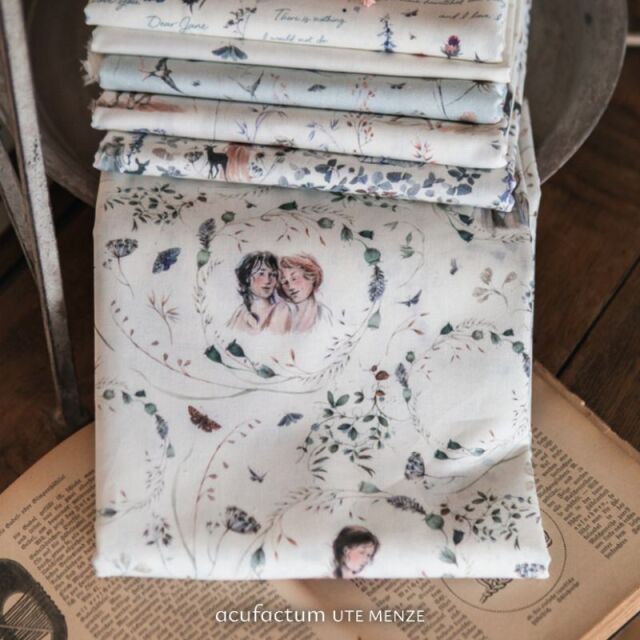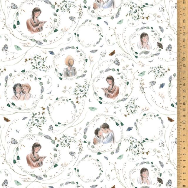 「My Dear Jane」で使われているこの魅力的なコットン生地は、優雅さとロマンを感じさせる世界へと誘います。才能あるソフィア・ドレッシャーによる美しいイラストレーションは、まるで静かな夢のような瞬間を捉えています。繊細な花の冠がデザインを飾り、優しい草や花々が広がり、静かな夏の庭を思い起こさせます。冠の間には、小さな蝶やミツバチが飛び交い、遊び心と軽やかさを与えています。しかし、この生地を特別なものにしているのは、そのポートレートです。温かいまなざしでお互いを見つめる二人の姉妹、そして優しく寄り添う恋人たちの姿。すべてのディテールが愛情を込めて描かれており、花の香りやミツバチの羽音が聞こえてくるような気がします。