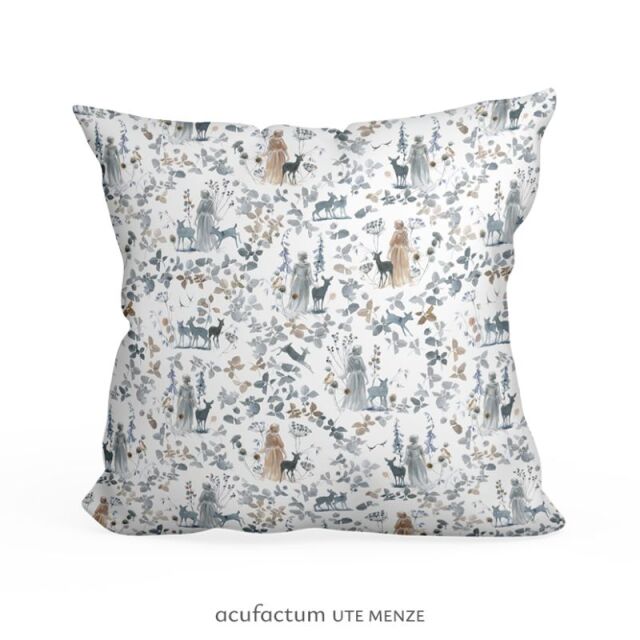 その繊細な葉の間に、シルエットのようなシーンが広がり、自然の中で過ごす女性たちと優雅な鹿たちが描かれています ― それは、調和と静かな美しさを象徴する風景です。