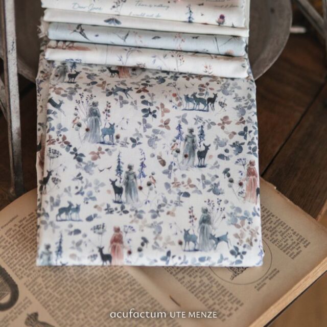 「My Dear Jane」で使われているこのコットン生地は、優雅さとロマンに満ちた魅惑的な世界へとあなたを誘います。ソフィア・ドレッシャーは、水彩画技法を駆使して、繊細なバラの花びらの迷路を通り抜けるようなデザインを創り出しました。