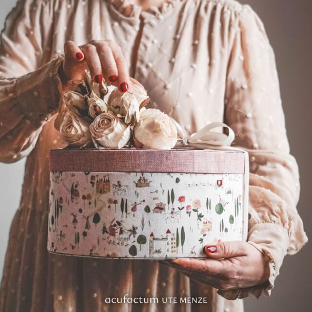 バロック様式の貴族たち、華やかな王子と王女、カエルの王様など、さまざまなおとぎ話のモチーフが歴史的な風景に溶け込んでいます。夢のような公園の風景には、バラや馬車、大きな城が描かれ、ロマンチックで優雅な時代が感じられます。繊細に描かれた人物たち?馬に乗る王女や王子?が、おとぎ話のモチーフと調和し美しい構図を作り出しています。