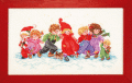 雪の中ではしゃいで遊んでいる子供たちの表情がかわいいデザインです。