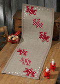 ストライプや雪模様の赤いトナカイがデザインされたテーブルランナーです。