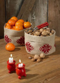 赤いノルディック模様がデザインされたジュート麻のバスケット。
