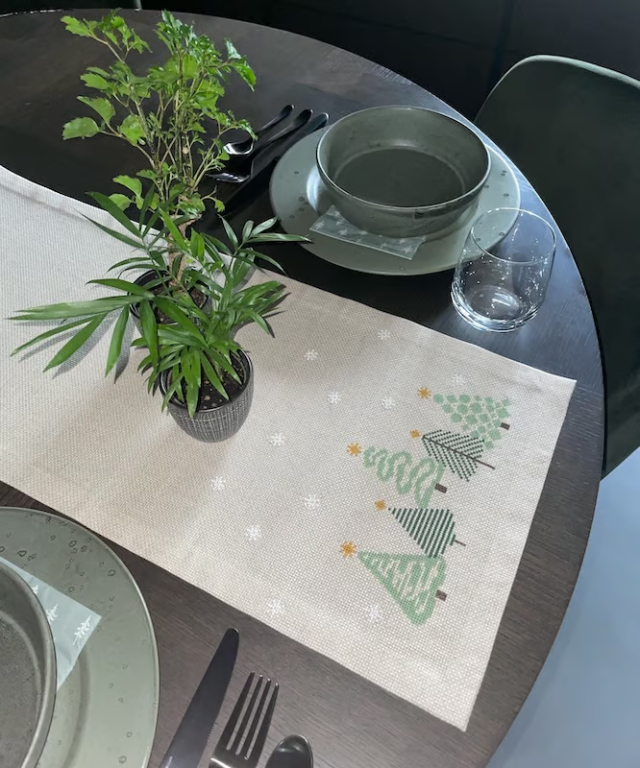 2色の美しい落ち着いたグリーンのクリスマスツリーと雪の結晶のランナーです。