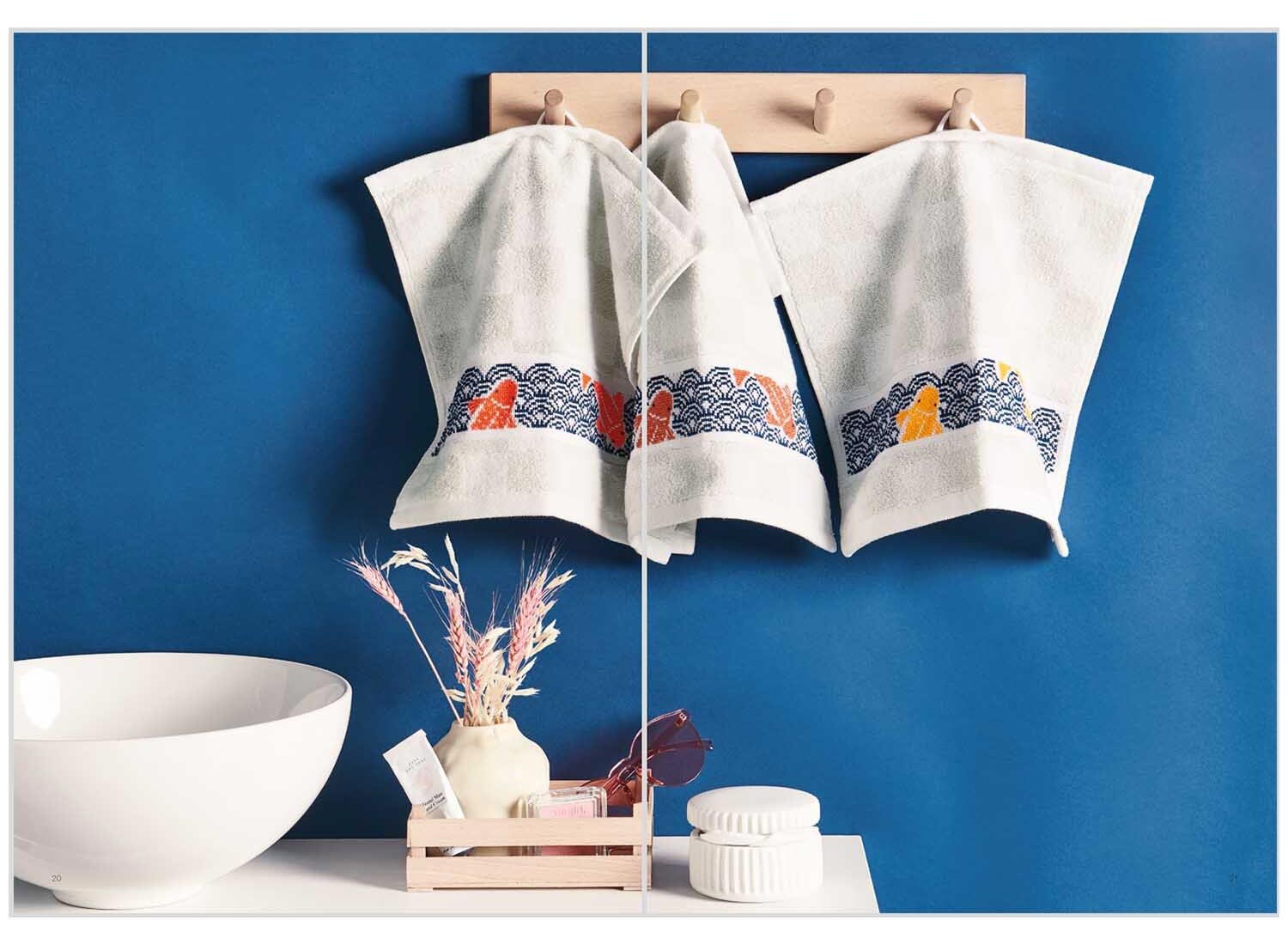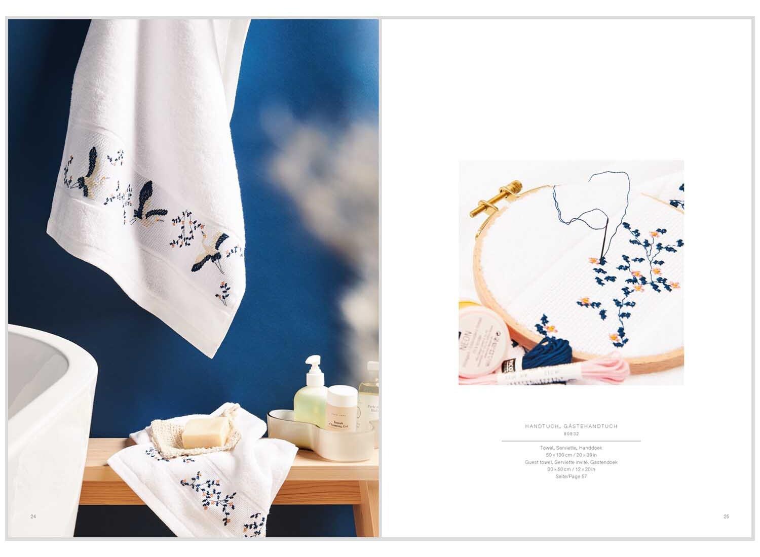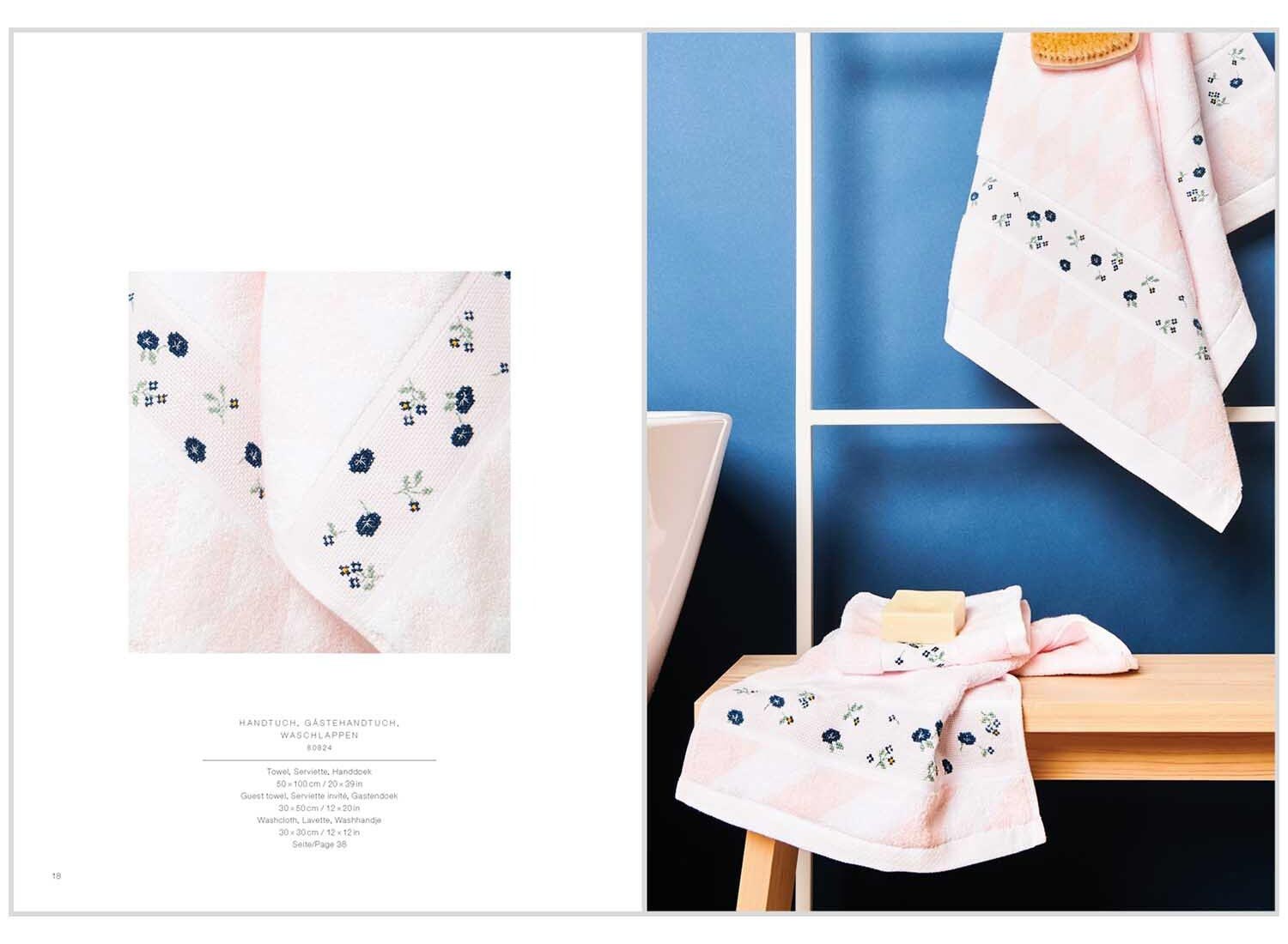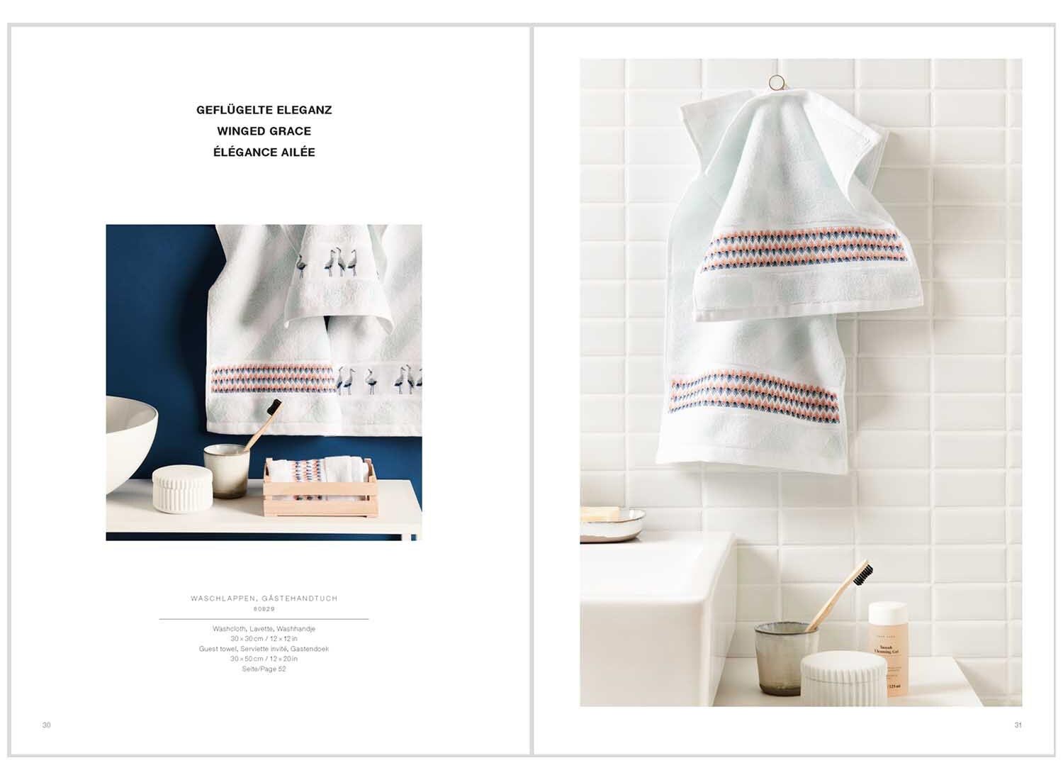 ホワイト、パウダー、グレー、ブルー、ミントなどのタイムレスでモダンなテリータオルに刺繍。