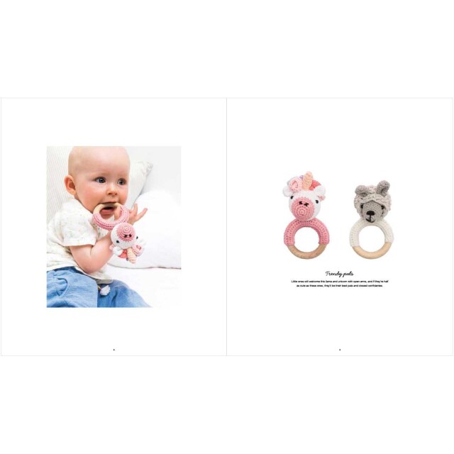 この「リコルミベビー 小さな動物たち」には、子供部屋用のおもちゃやかわいい小物が紹介されています。テディベアやウサギなどのかわいい動物のフィギュアが付いた歯固めリングやモビールをかぎ針編みで作ります。