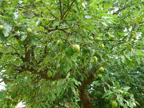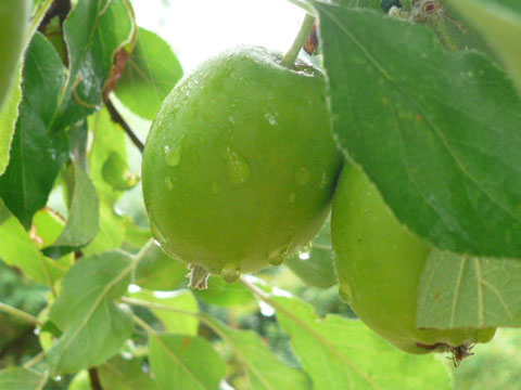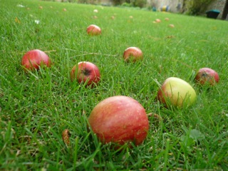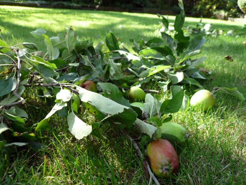 台風のような強い風が吹き抜けた翌朝、庭のリンゴが