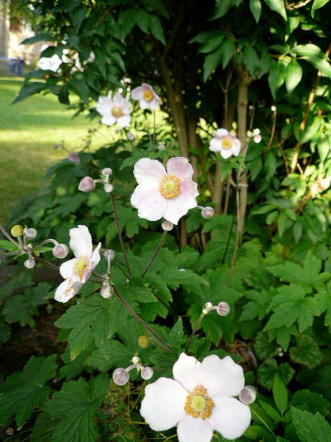 シュウメイ菊が紫陽花の植え込みの間から薄桃色の花びらを覗かせています。