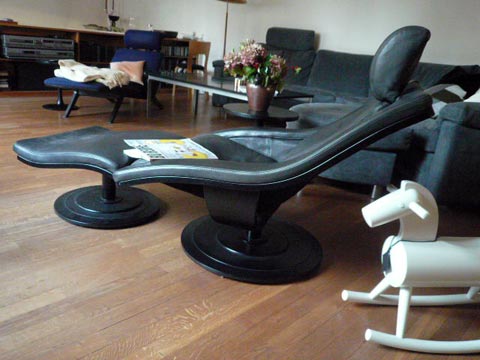 私の指定席。後方のブルーの寝椅子は家人の指定席です。